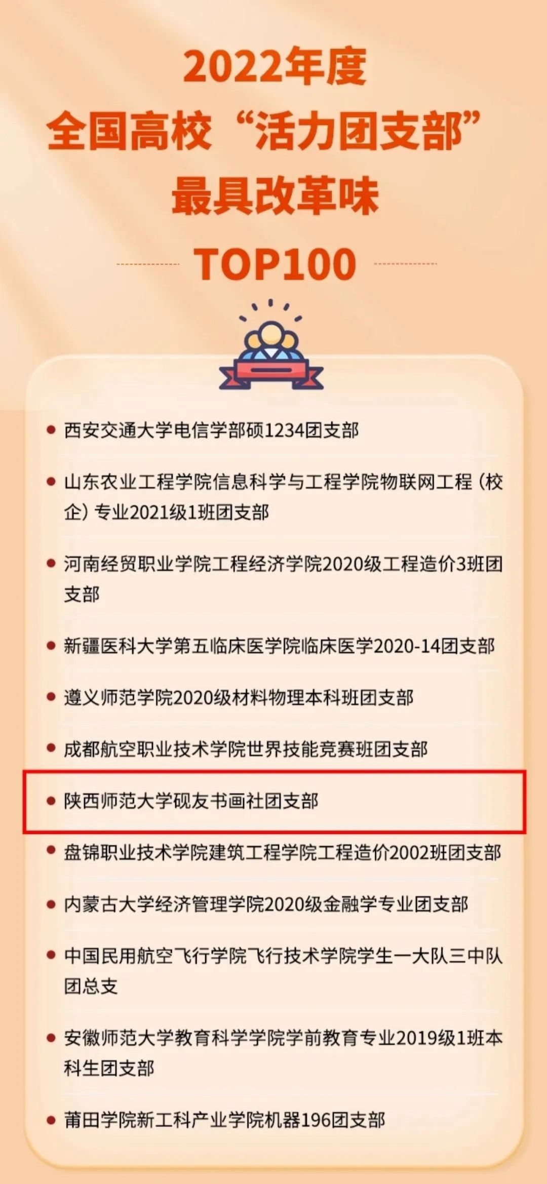 其中,改革味方面,重点围绕“创新支部组织机制与活动方式,做到团员主要的学习实践活动由支部组织、政治骨干由支部推荐、团内荣誉由支部评议、帮扶对象由支部推选”等方面,经过校内选树、校级展示、省级展示、全国展示等环节,形成《2022年度全国高校“活力团支部”最具改革味TOP100榜》,公布如下。